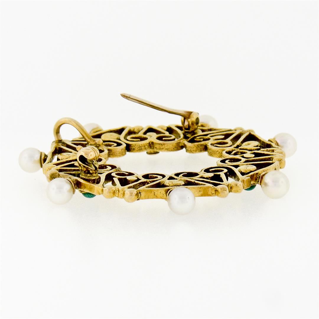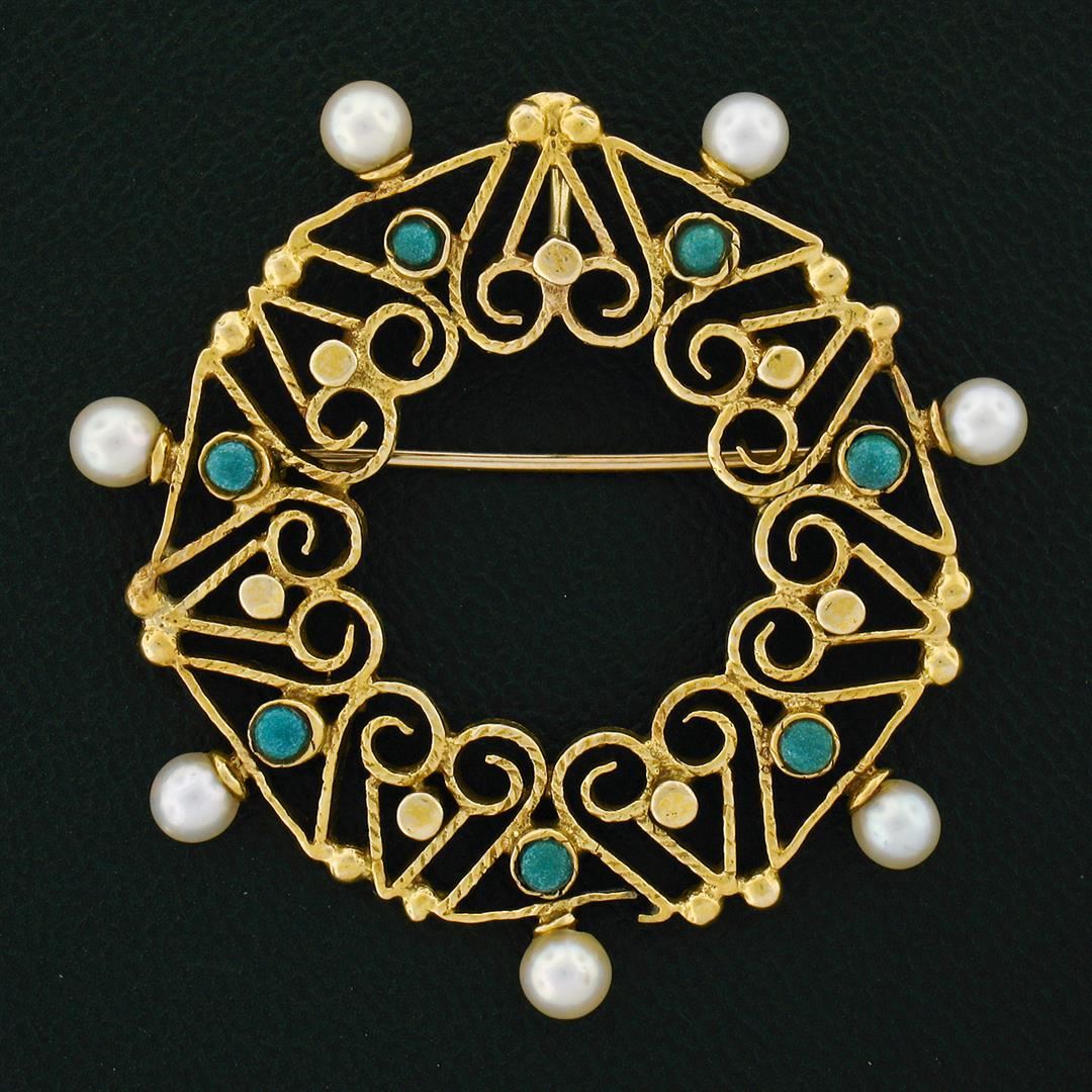 Vintage Victorian Revival 14k Gold Turquoise & Pearl Open Circle Brooch Pendant