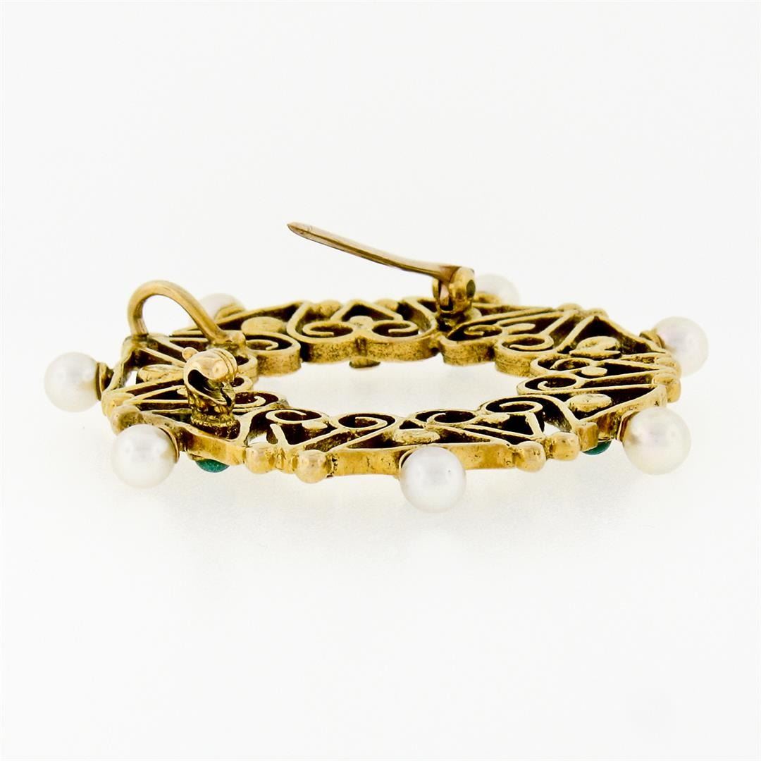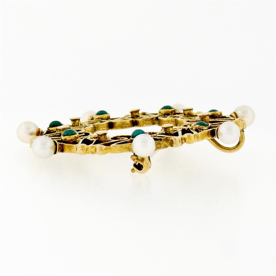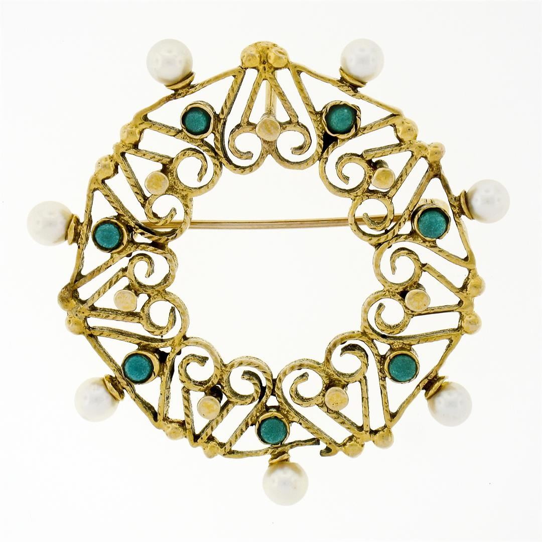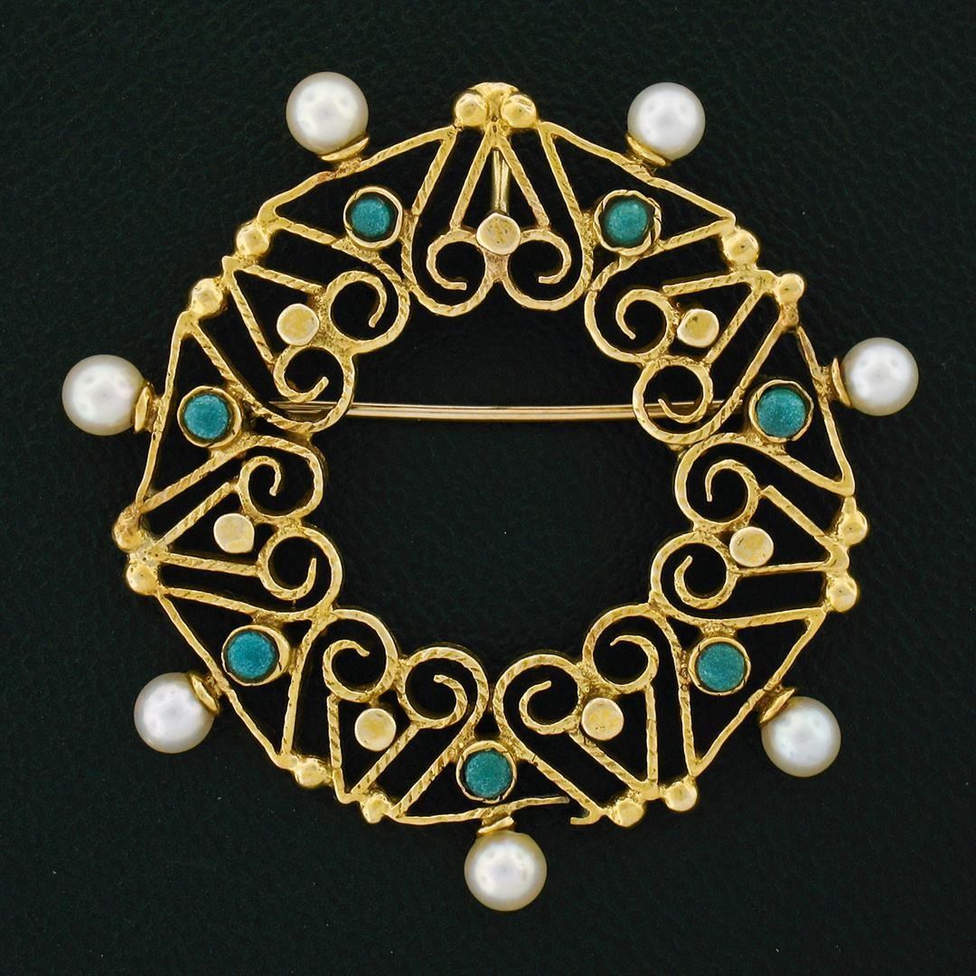 A vintage solid 14k yellow gold brooch pendant. with 7 round cabochon cut natural turquoise (2.40mm), and 7 round shape natural cultured pearls (2.75-4.0mm). Measures 41mm in diameter and weighs a total of 9.53 grams.