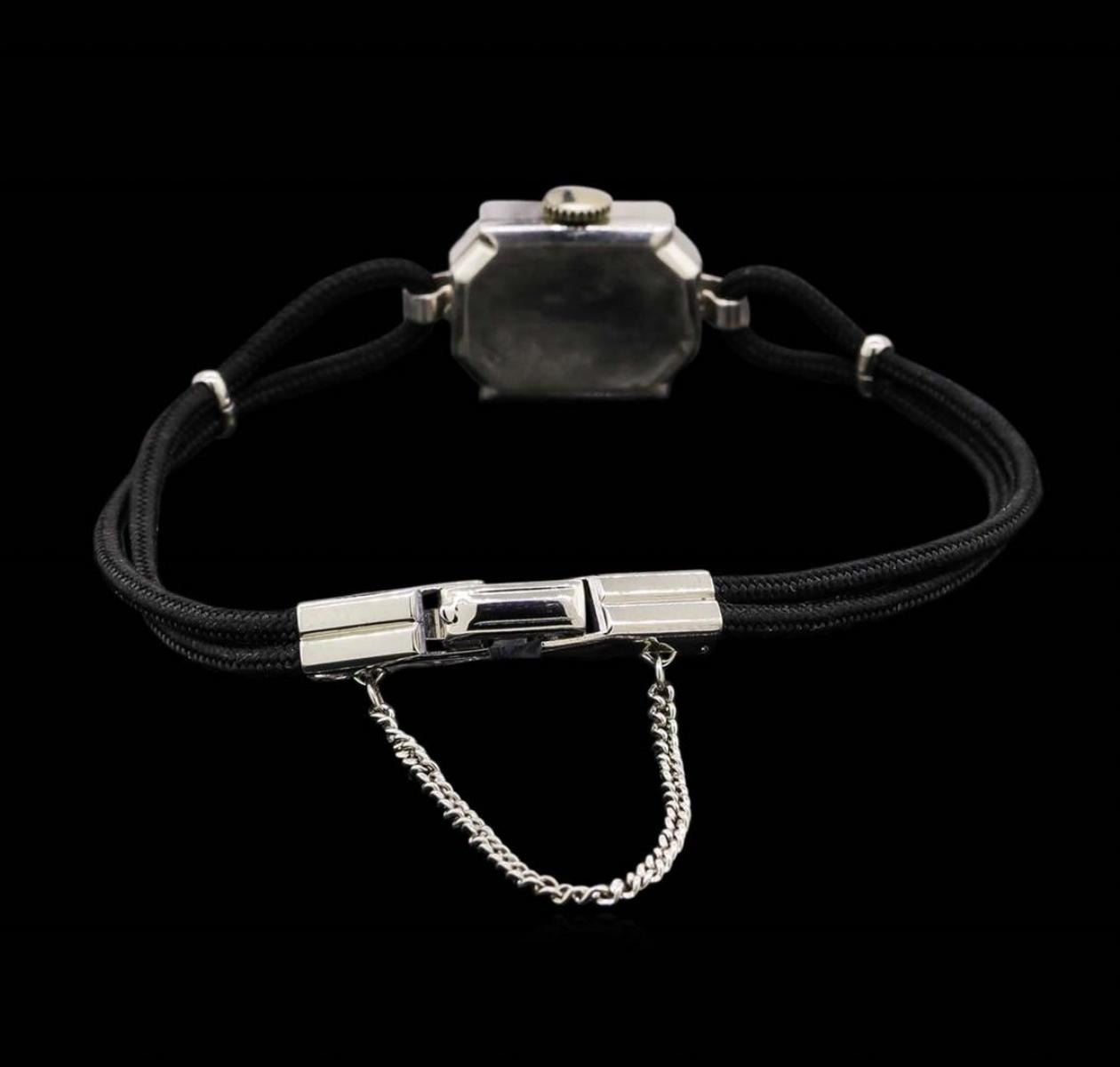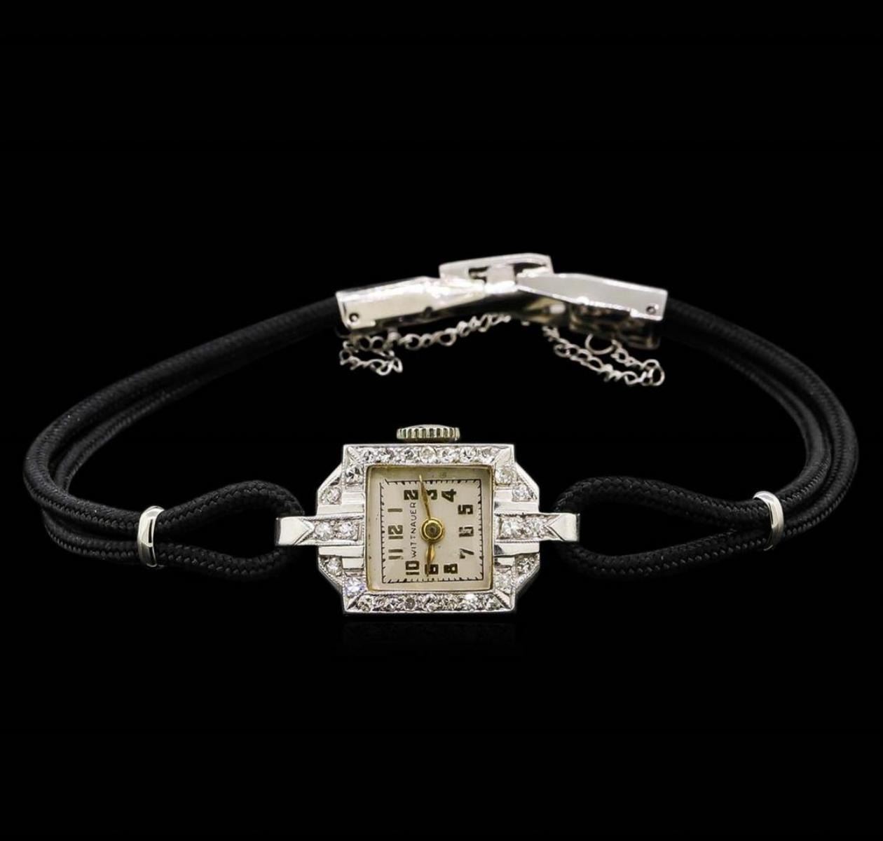One ladies, vintage Wittnauer diamond wristwatch electronically tested, platinum, Case: 17mm x 13mm, Case Back: space is available for engraving, Crown: scalloped, Bezel: diamond set, Case Lugs: diamond set, Crystal: domed acrylic. Paul V. Eisner & Co. Swiss Movement: seventeen jewel unadjusted mechanical, Dial: Ivory color, with Gold color baton pointed hands, & numerals, Bracelet: double strand Black cord, Condition: G-4 Average. Bright polish finish, Seven inch length. Stainless Steel over locking clasp, with safety chain. Containing: Twenty Five prong set single cut diamonds, approximate. Total Weight of 28 Stones = 0.25ct. Graded in the setting. Clarity: VS-2 to SI-2. Color: G - I. Total Weight of Diamonds 0.25ct. Total Weight of Watch 9.33 grams. AIG Appraised at $4,050.00.