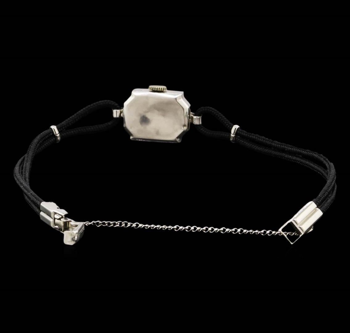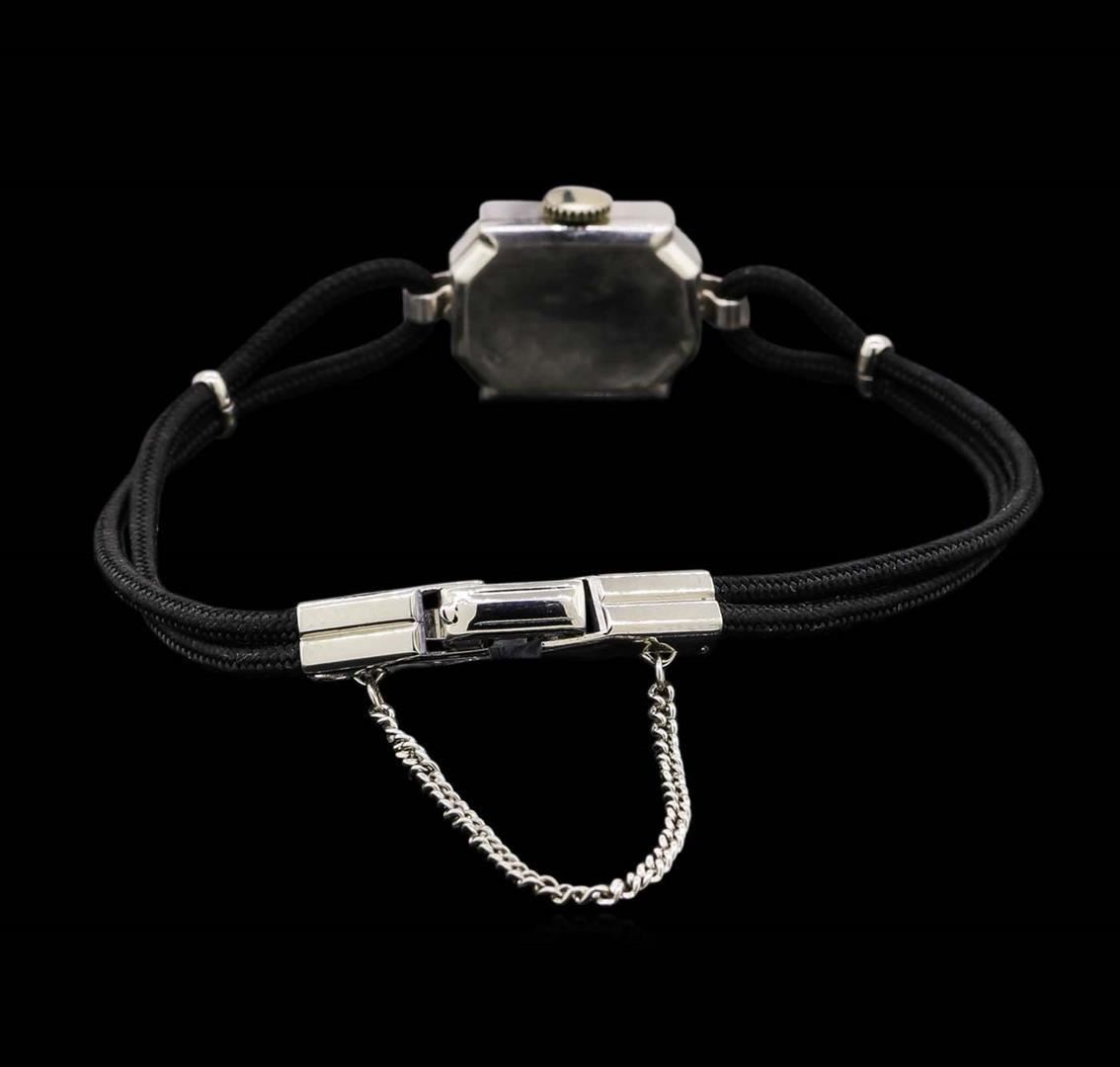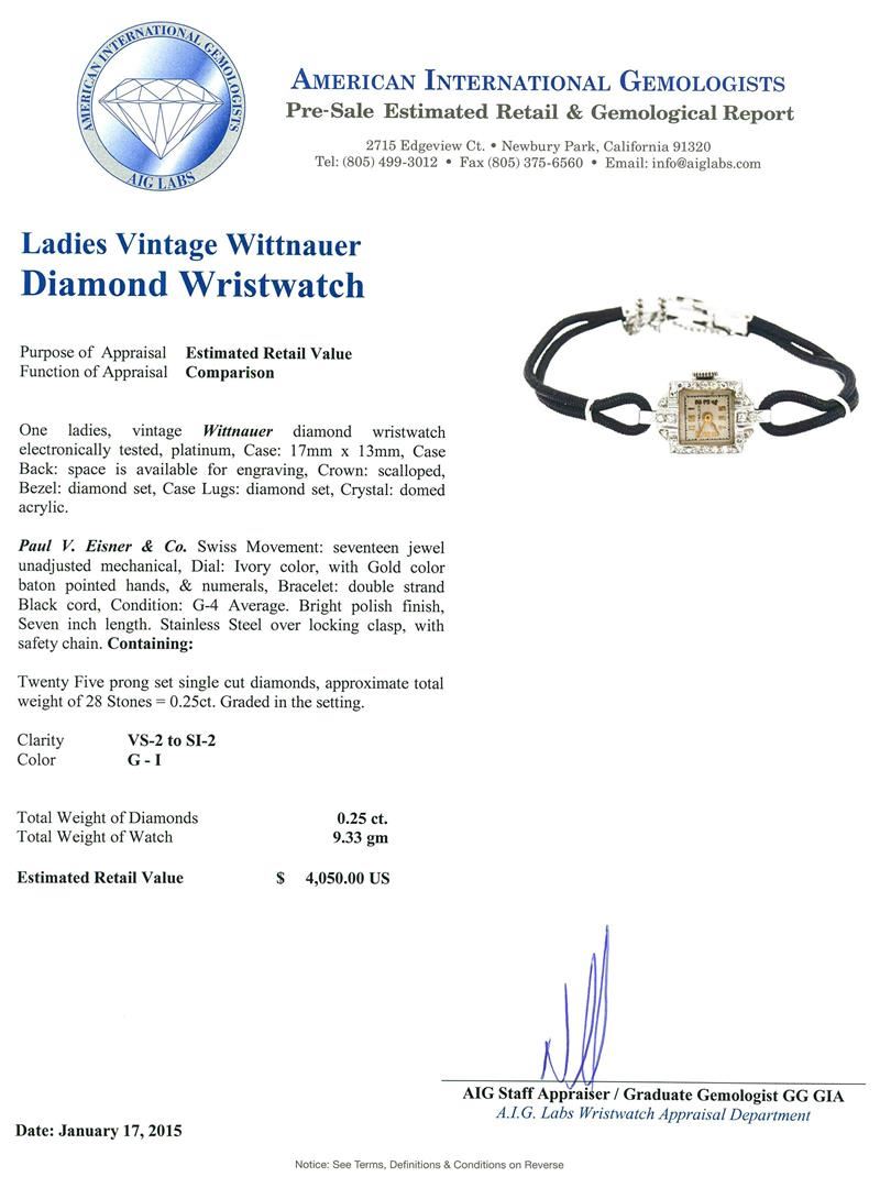 One ladies, vintage Wittnauer diamond wristwatch electronically tested, platinum, Case: 17mm x 13mm, Case Back: space is available for engraving, Crown: scalloped, Bezel: diamond set, Case Lugs: diamond set, Crystal: domed acrylic. Paul V. Eisner & Co. Swiss Movement: seventeen jewel unadjusted mechanical, Dial: Ivory color, with Gold color baton pointed hands, & numerals, Bracelet: double strand Black cord, Condition: G-4 Average. Bright polish finish, Seven inch length. Stainless Steel over locking clasp, with safety chain. Containing: Twenty Five prong set single cut diamonds, approximate. Total Weight of 28 Stones = 0.25ct. Graded in the setting. Clarity: VS-2 to SI-2. Color: G - I. Total Weight of Diamonds 0.25ct. Total Weight of Watch 9.33 grams. AIG Appraised.