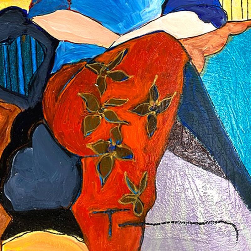 "Waiting" is a one-of-a-kind mixed media over paint on wood by Itzchak Tarkay (1935-2012), hand signed by the artist. Includes Letter of Authenticity. Measures approx. 11.5" x 8" (image).