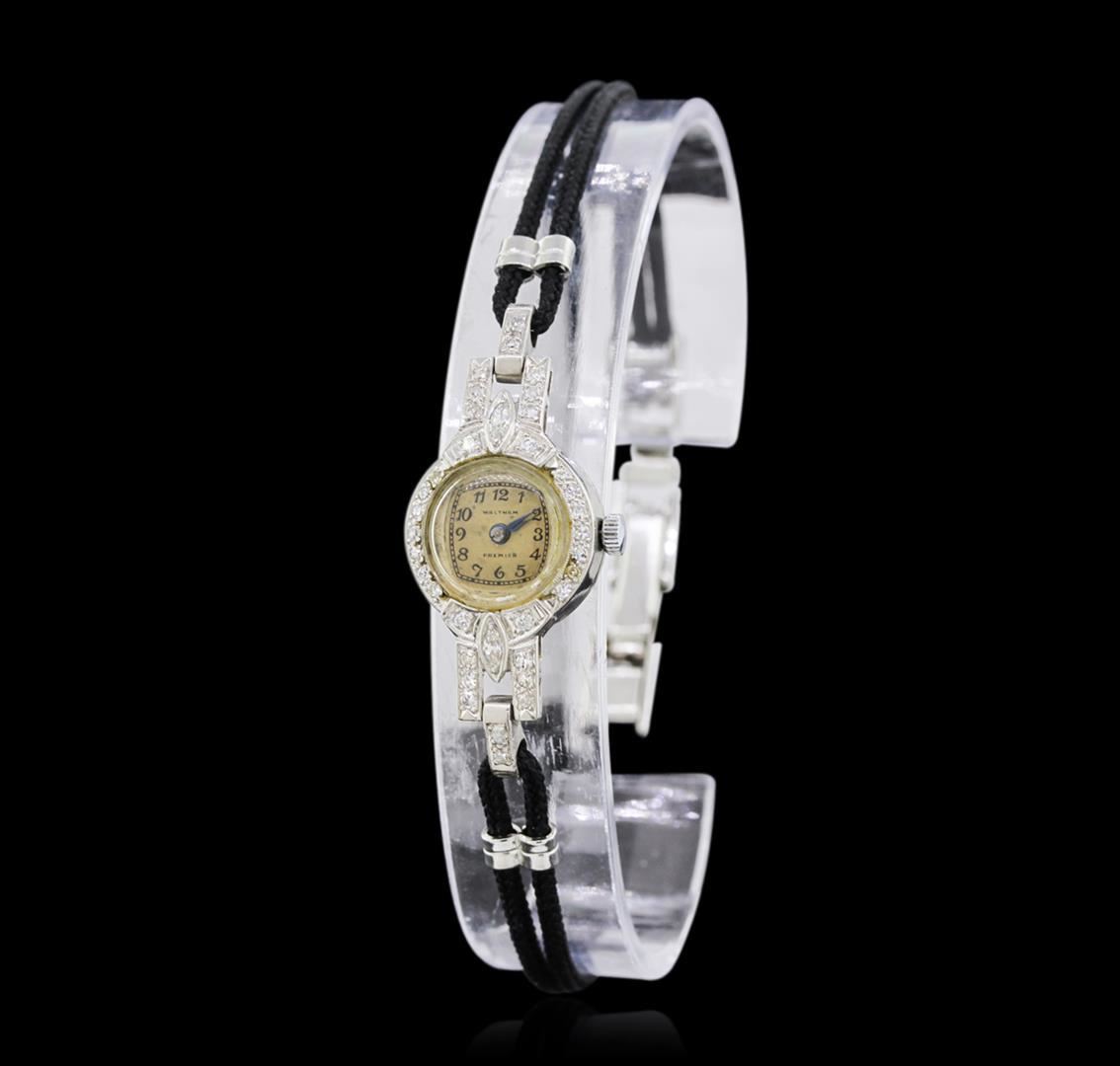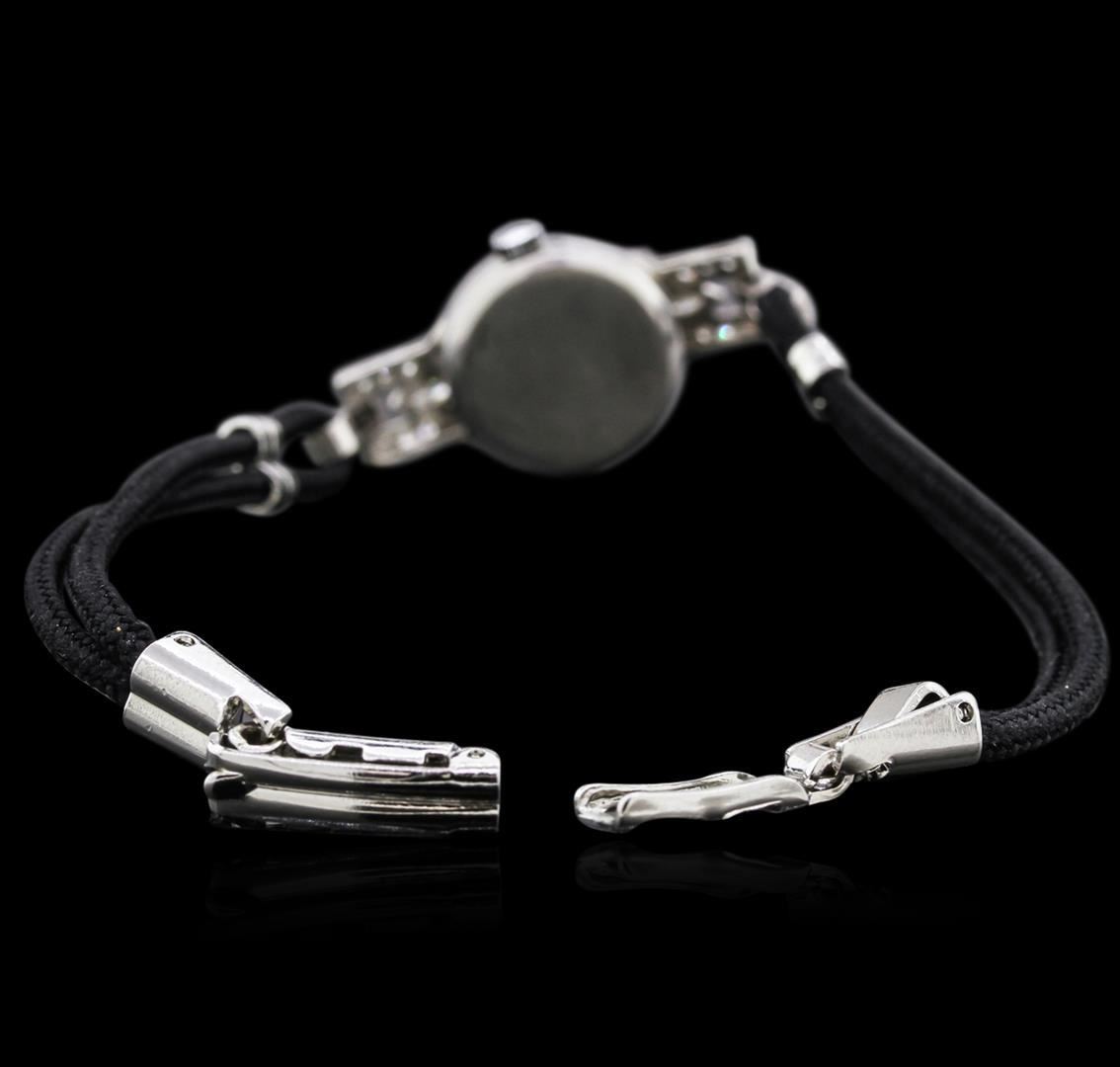 One ladies, vintage Waltham wristwatch electronically tested platinum, Case: 16mm diameter, Case Back: space available for engraving, Fixed Case Lugs: set throughout with diamonds, Flexible Case Lug Terminals: set with diamonds, Crown: scalloped edge, Bezel: diamond set, Crystal: acrylic. Waltham USA Movement: Seventeen jewel mechanical stem wind, Signed Dial: Dark Ivory color, Blue steel pointed hands, and numerals, Bracelet: Black double cord, Condition: G-5 Fine. Seven and one quarter inch length, adjustable. Containing: Forty prong & bezel set single & marquise cut diamonds approximate total weight of 40 Stones = 0.48 ct. Graded in the setting. Clarity: VS-2 to SI-2 Average. Color: F - H. Total Weight of Diamonds: 0.48ct. Total Weight of Watch: 12.78 grams. AIG Appraised.