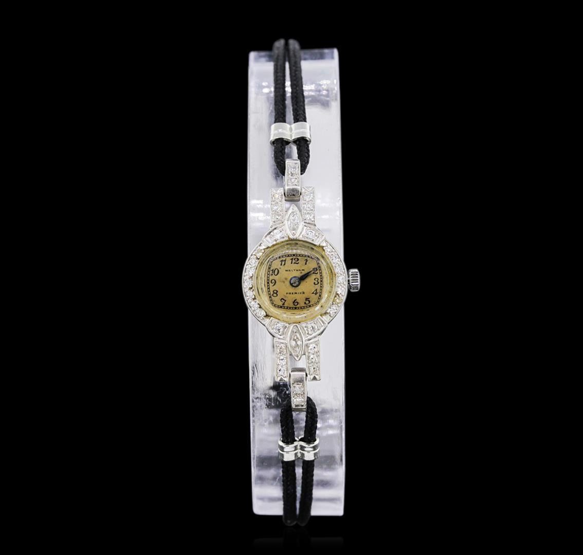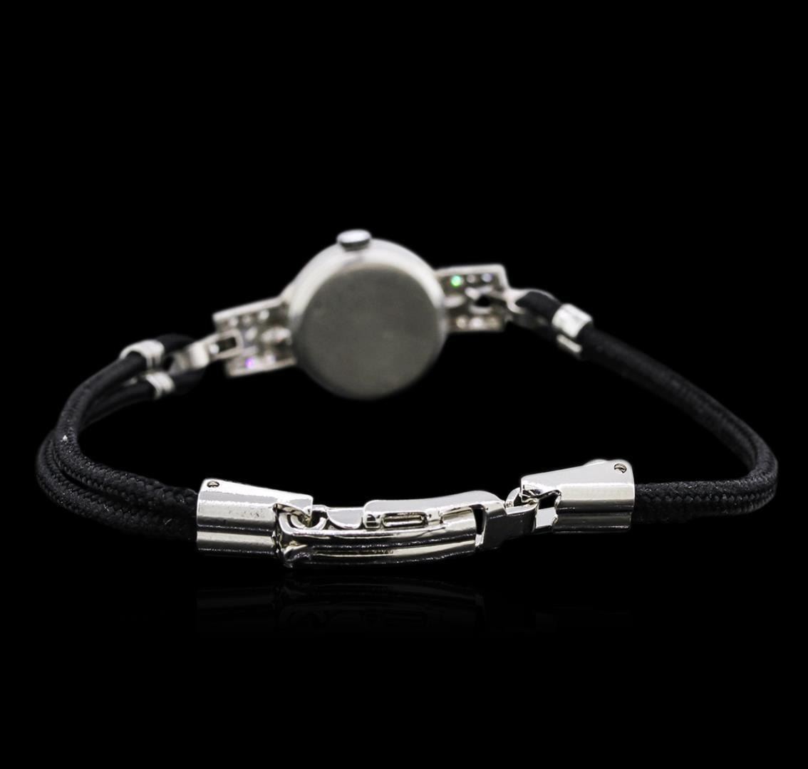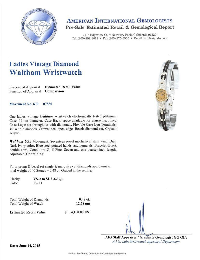 One ladies, vintage Waltham wristwatch electronically tested platinum, Case: 16mm diameter, Case Back: space available for engraving, Fixed Case Lugs: set throughout with diamonds, Flexible Case Lug Terminals: set with diamonds, Crown: scalloped edge, Bezel: diamond set, Crystal: acrylic. Waltham USA Movement: Seventeen jewel mechanical stem wind, Signed Dial: Dark Ivory color, Blue steel pointed hands, and numerals, Bracelet: Black double cord, Condition: G-5 Fine. Seven and one quarter inch length, adjustable. Containing: Forty prong & bezel set single & marquise cut diamonds approximate total weight of 40 Stones = 0.48 ct. Graded in the setting. Clarity: VS-2 to SI-2 Average. Color: F - H. Total Weight of Diamonds: 0.48ct. Total Weight of Watch: 12.78 grams. AIG Appraised.