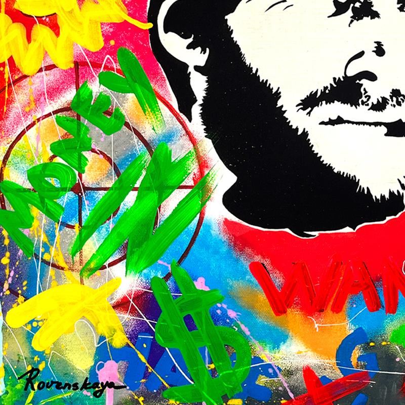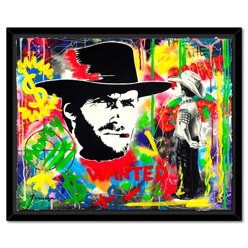 "Wanted" is a one-of-a-kind mixed media on deckle edge paper by Nastya Rovenskaya; hand signed by the artist. This piece comes custom framed and includes letter of authenticity. Measures approximately 30" x 37" (framed), 24" x 31" (image).