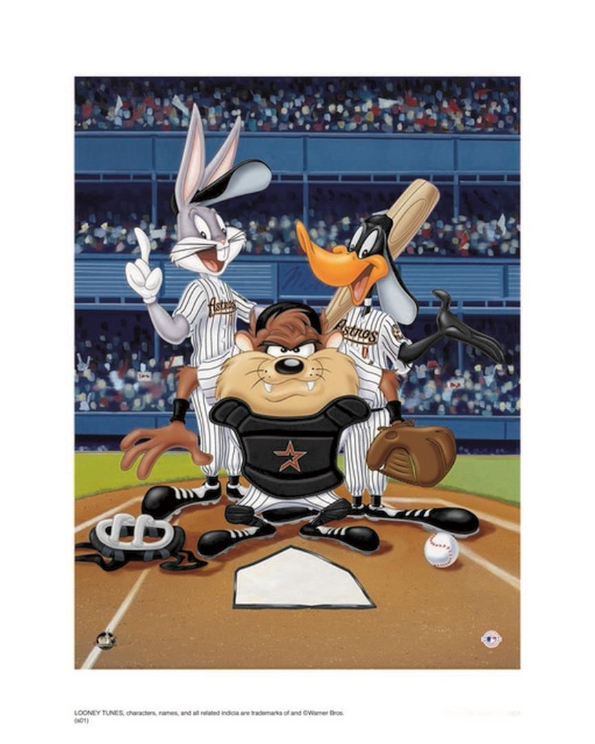 Artist: Warner Brothers - Title: At the Plate Astros - Medium: Giclee on Fine Art Paper - Limited Edition: 500 - Image Size: Approximately 16 Inches x 12 inches - Paper Size: Approximately 16 inches x 20 inches - Unframed - Details: This work comes with a Warner Brothers Hologram for Authenticity - The three Warner Directors were expected to turn out ten six-minute cartoons each year, or one every five weeks! And, each director had his own lead designer, background artist, and a team of animators. Mel Blanc provided the common thread as the man of a thousand voices, and Carl Stalling is most recognized as the Music Director for the majority of the Warner Bros. shorts