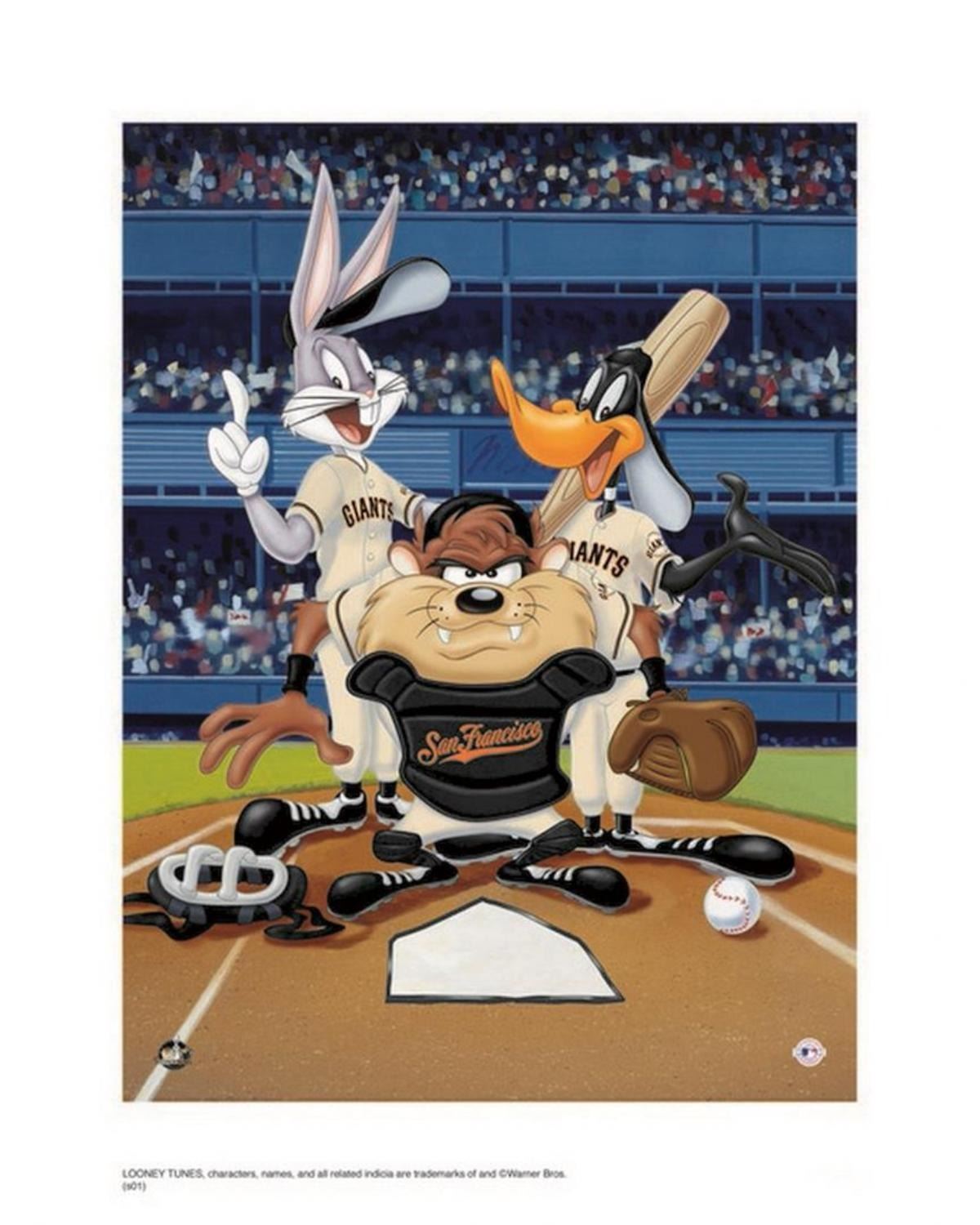 Artist: Warner Brothers - Title: At the Plate Giants - Medium: Giclee on Fine Art Paper - Limited Edition: 500 - Image Size: Approximately 16 Inches x 12 inches - Paper Size: Approximately 20 inches x 16 inches - Unframed - Details: This work comes with a Warner Brothers Hologram for Authenticity - The three Warner Directors were expected to turn out ten six-minute cartoons each year, or one every five weeks! And, each director had his own lead designer, background artist, and a team of animators. Mel Blanc provided the common thread as the man of a thousand voices, and Carl Stalling is most recognized as the Music Director for the majority of the Warner Bros. shorts