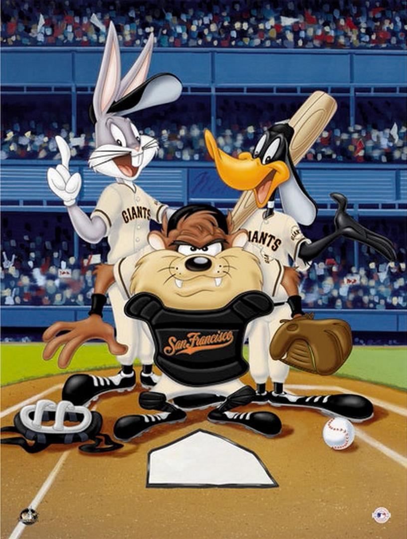 Artist: Warner Brothers - Title: At the Plate Giants - Medium: Giclee on Fine Art Paper - Limited Edition: 500 - Image Size: Approximately 16 Inches x 12 inches - Paper Size: Approximately 20 inches x 16 inches - Unframed - Details: This work comes with a Warner Brothers Hologram for Authenticity - The three Warner Directors were expected to turn out ten six-minute cartoons each year, or one every five weeks! And, each director had his own lead designer, background artist, and a team of animators. Mel Blanc provided the common thread as the man of a thousand voices, and Carl Stalling is most recognized as the Music Director for the majority of the Warner Bros. shorts