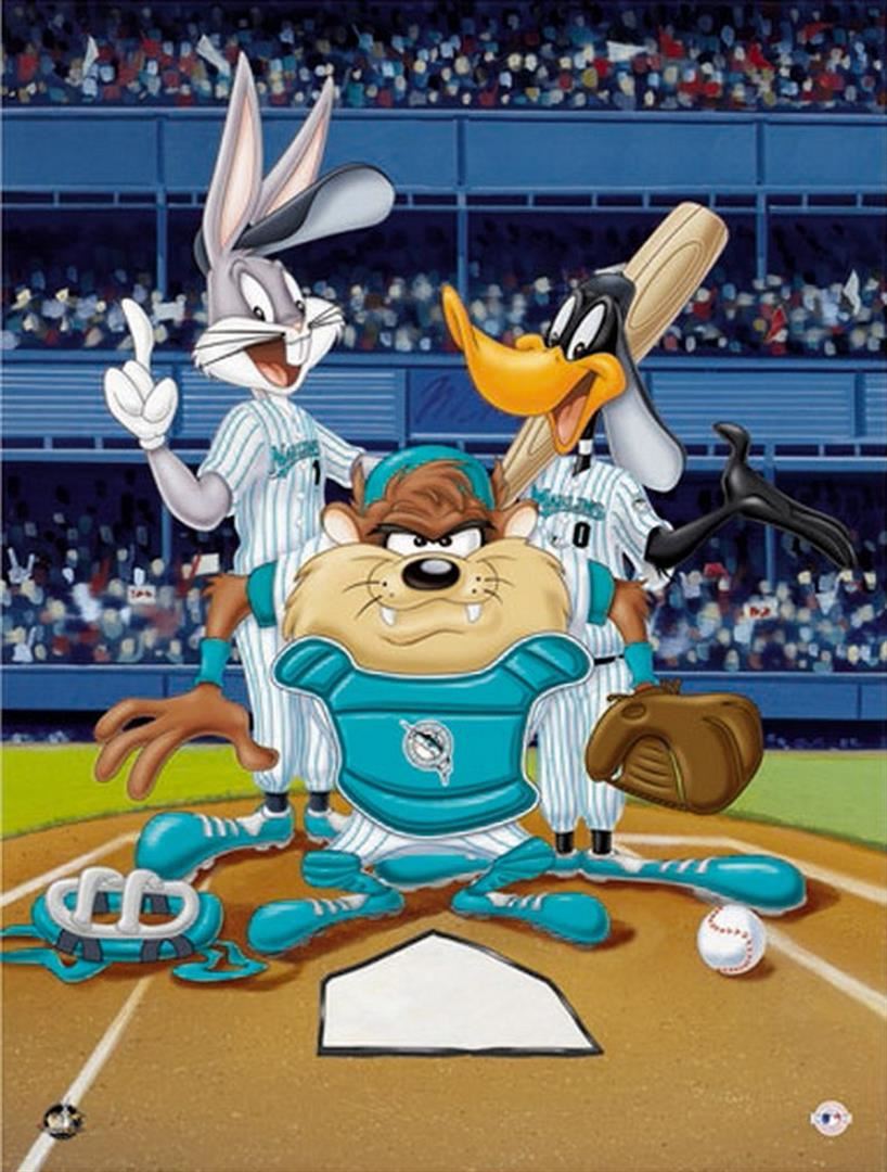 Artist: Warner Brothers - Title: At the Plate Marlins - Medium: Giclee on Fine Art Paper - Limited Edition: 500 - Image Size: Approximately 16 Inches x 12 inches - Paper Size: Approximately 20 inches x 16 inches - Unframed - Details: This work comes with a Warner Brothers Hologram for Authenticity - The three Warner Directors were expected to turn out ten six-minute cartoons each year, or one every five weeks! And, each director had his own lead designer, background artist, and a team of animators. Mel Blanc provided the common thread as the man of a thousand voices, and Carl Stalling is most recognized as the Music Director for the majority of the Warner Bros. shorts