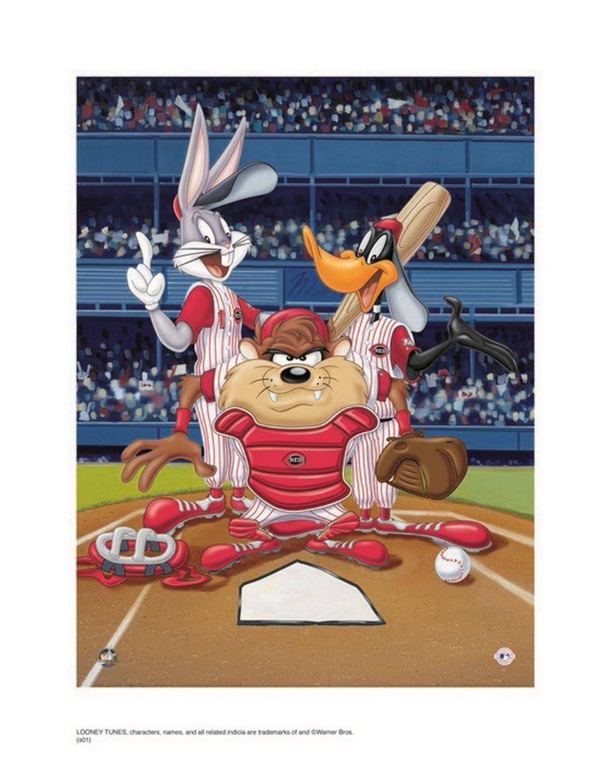 Artist: Warner Brothers - Title: At the Plate Reds - Medium: Giclee on Fine Art Paper - Limited Edition: 500 - Image Size: Approximately 16 Inches x 12 inches - Paper Size: Approximately 20 inches x 16 inches - Unframed - Details: This work comes with a Warner Brothers Hologram for Authenticity - The three Warner Directors were expected to turn out ten six-minute cartoons each year, or one every five weeks! And, each director had his own lead designer, background artist, and a team of animators. Mel Blanc provided the common thread as the man of a thousand voices, and Carl Stalling is most recognized as the Music Director for the majority of the Warner Bros. shorts