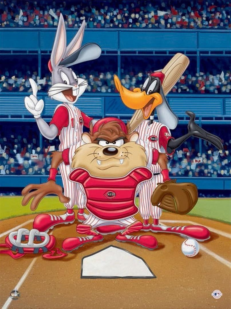 Artist: Warner Brothers - Title: At the Plate Reds - Medium: Giclee on Fine Art Paper - Limited Edition: 500 - Image Size: Approximately 16 Inches x 12 inches - Paper Size: Approximately 20 inches x 16 inches - Unframed - Details: This work comes with a Warner Brothers Hologram for Authenticity - The three Warner Directors were expected to turn out ten six-minute cartoons each year, or one every five weeks! And, each director had his own lead designer, background artist, and a team of animators. Mel Blanc provided the common thread as the man of a thousand voices, and Carl Stalling is most recognized as the Music Director for the majority of the Warner Bros. shorts
