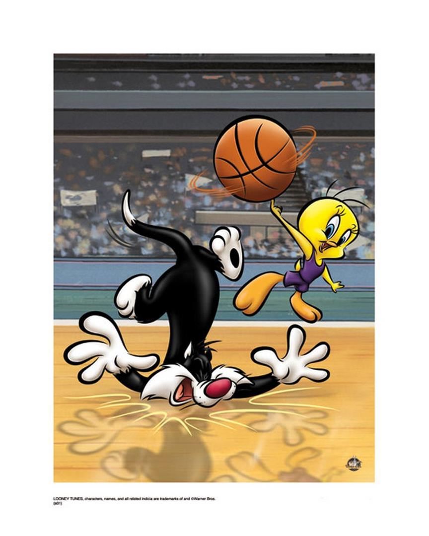 Artist: Warner Brothers - Title: Sylvester and Tweety Basketball - Medium: Giclee on Fine Art Paper - Limited Edition: 500 - Image Size: Approximately 16 Inches x 12 inches - Paper Size: Approximately 20 inches x 16 inches - Unframed - Details: This work comes with a Warner Brothers Hologram for Authenticity - The three Warner Directors were expected to turn out ten six-minute cartoons each year, or one every five weeks! And, each director had his own lead designer, background artist, and a team of animators. Mel Blanc provided the common thread as the man of a thousand voices, and Carl Stalling is most recognized as the Music Director for the majority of the Warner Bros. shorts
