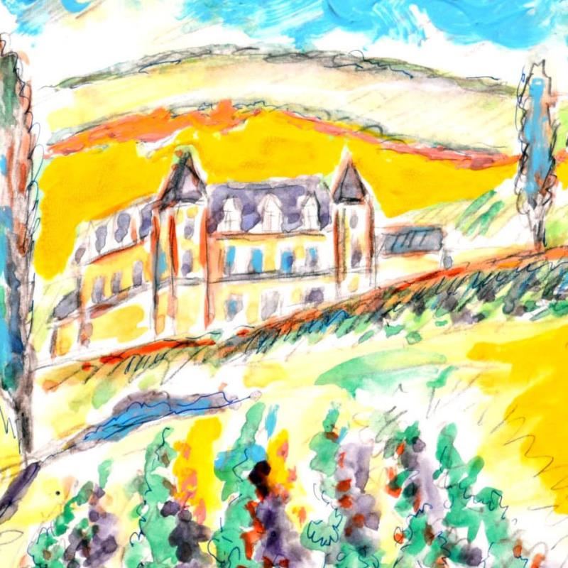 "Chateau Clos de Vougeot, Burgundy" is an original Mixed Media on Board by Wayne Ensrud. The piece is hand signed by the artist and comes with a Certificate of Authenticity. Measures approximately 10" x 10".