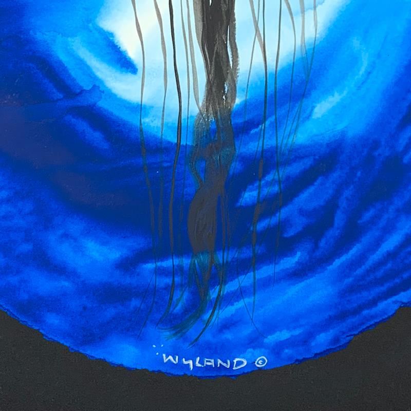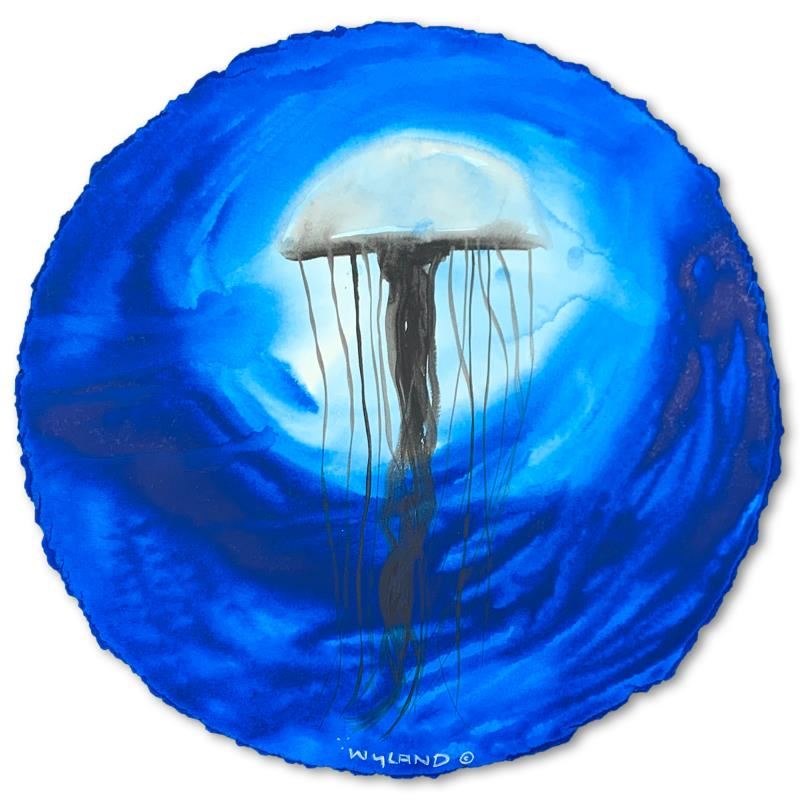 "Weightless Blue Jellyfish" is an original painting, watercolor on deckle edge paper by Wyland. Hand signed by the artist, the piece comes custom framed and with a letter of authenticity. Measures approximately 30" x 30" (framed), 19.5" x 19.5" (image).