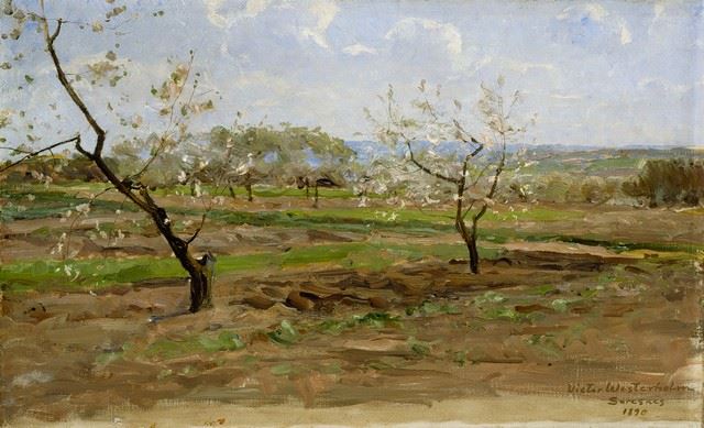 Artist: Victor Axel Westerholm - Title: Kukkiviahedelmapuita - Medium: Fine Art Reproduction Giclee on Canvas - Image Size: Approximately 12 inches x 20 inches - Unframed on Unstretched Canvas - Biography: Victor Axel Westerholm (4 January 1860 - 19 November 1919) was a Finnish landscape painter.