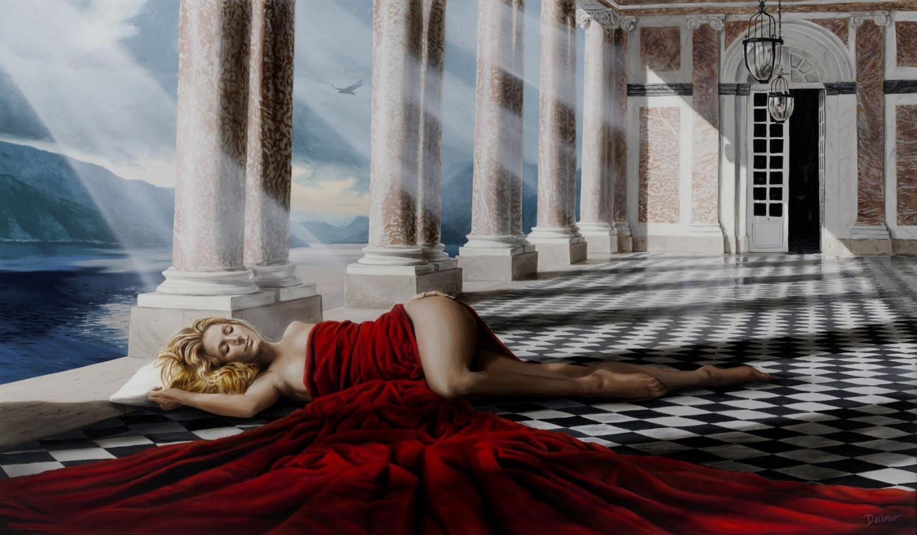 DELLORCO is the spectator in the Palace of her Dreams , taking place beyond the curtain of consciousness in this 40"x24" giclee on canvas,