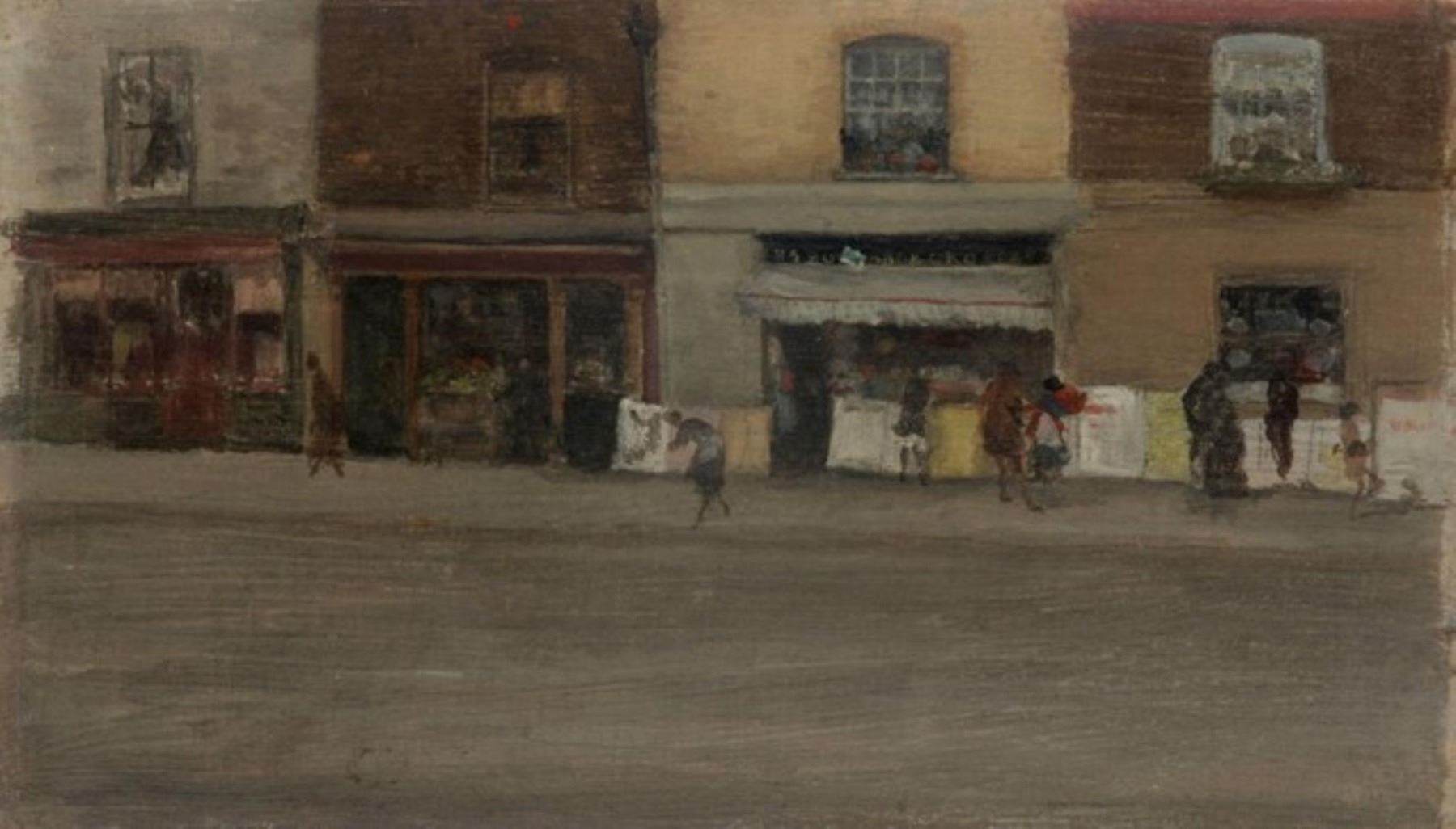 Artist: James Abbott McNeill Whistler - Title: Chelsea Shops - Medium: Fine Art Giclee on Canvas - Image Size: Approximately 11.5 inches x 20 inches - Framed: Unframed on Unstretched Canvas - Biography: James McNeill Whistler, in full James Abbott McNeill Whistler, (born July 11, 1834, Lowell, Massachusetts, U.S.--died July 17, 1903, London, England), American-born artist noted for his paintings of nocturnal London, for his striking and stylistically advanced full-length portraits, and for his brilliant etchings and lithographs. An articulate theorist about art, he did much to introduce modern French painting into England. His most famous work is Arrangement in Grey and Black No. 1 (1871; also called Portrait of the Artist's Mother or Whistler's Mother).