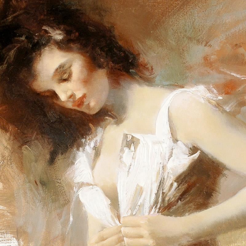 "White Camisole" is a limited edition giclee on canvas by Pino (1931-2010), numbered and hand signed by the artist. Includes Certificate of Authenticity. Measures approx. 10" x 14" (image).