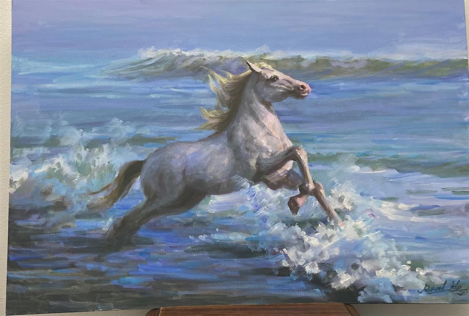 A 24x36" original acrylic on canvas by Richard Ho, White Stallion explodes with the power and beauty of a lone stallion.