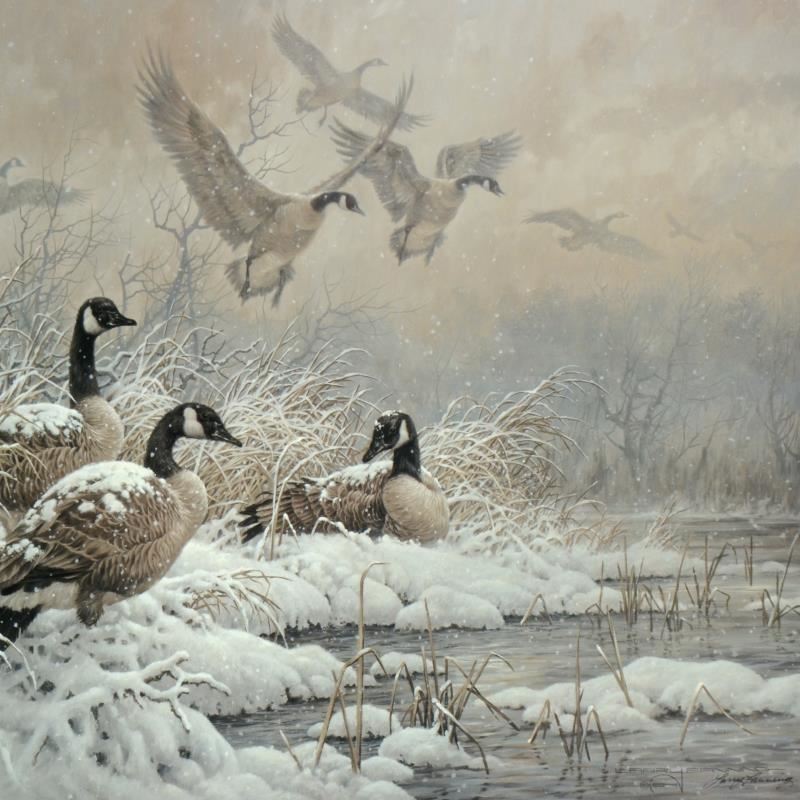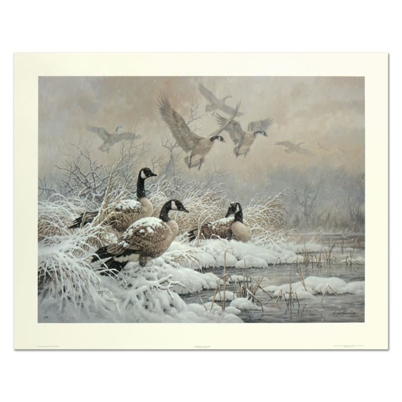 "Winter Retreat - Canada Geese" is a limited edition lithograph on paper by Larry Fanning (1938-2014) numbered and hand signed with a Letter of Authenticity. Measures approximately 30" x 22.5" (image).