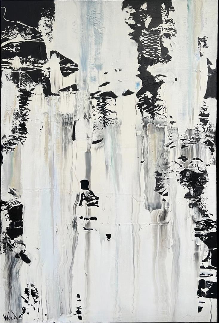 Abstract winter scene with gravitational pull and lots of detail. 40x30" Original acrylic on stretched canvas by Marion Wood. COA.