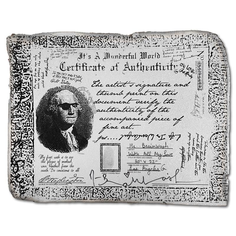 "With All My Love" is a mixed media original on deckle edge paper by Mr. Brainwash, hand signed inverso and bearing the thumbprint of the artist. This piece comes custom framed. Includes Certificate of Authenticity. Measures approx. 26" x 34" (frame), 22" x 30" (image).