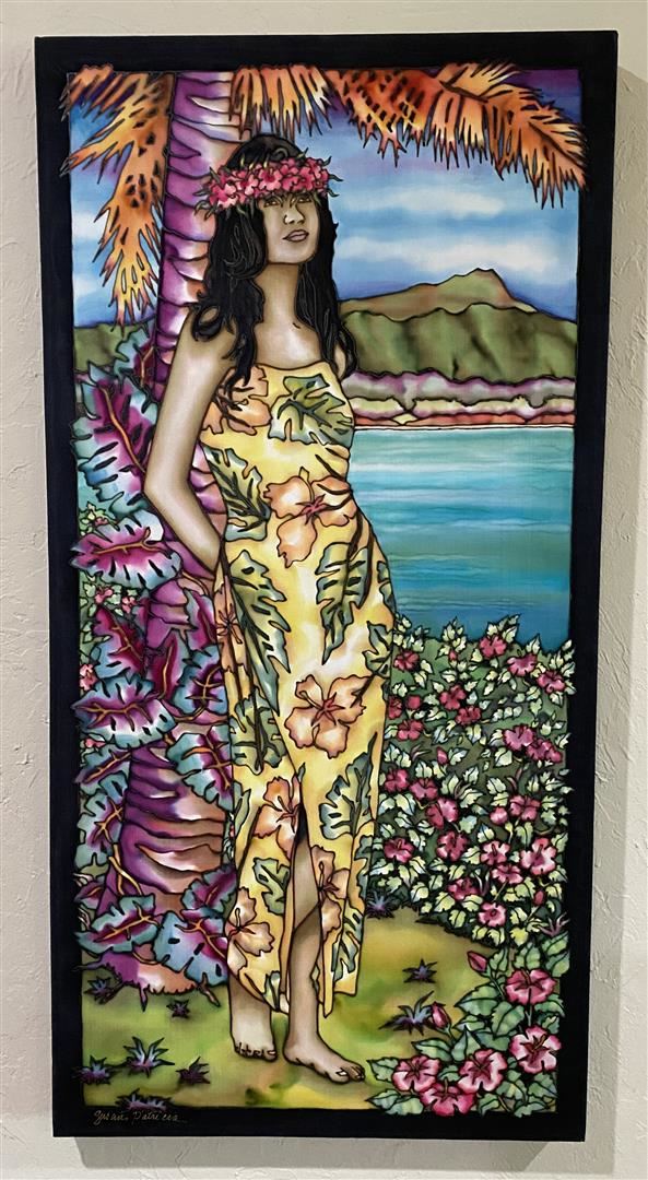 Susan Patricia's original on silk, a proto-typical native Hawaiian "With Flowers in Her Hair" is 18" x 36"