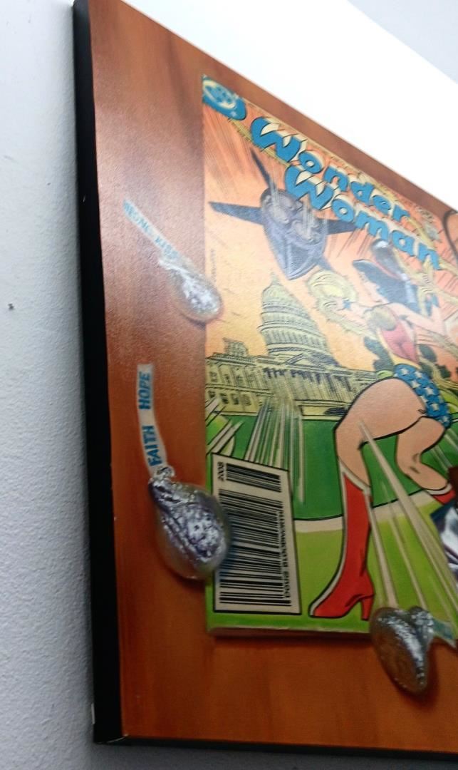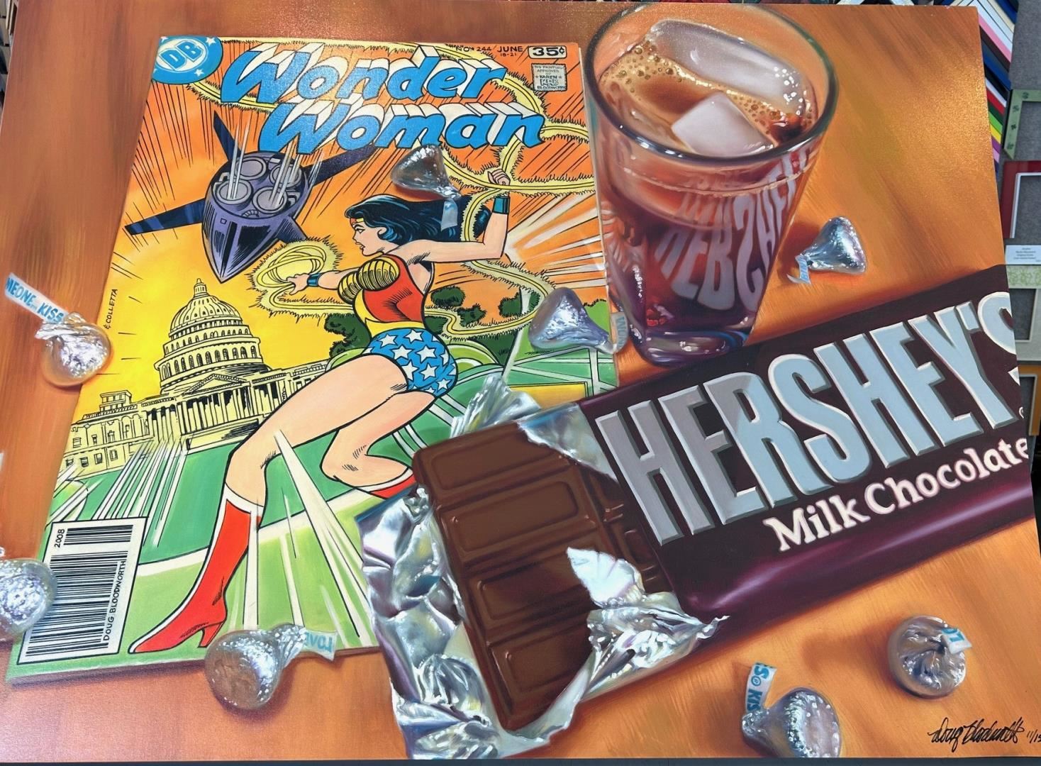 A hand-embellished 50x32" giclee on stretched canvas, Doug Bloodworth sweetens his Wonder Woman comic with kisses; signed & numbered 27/150