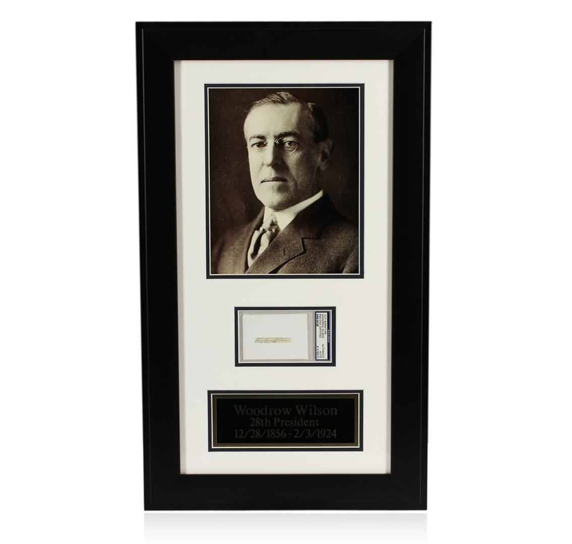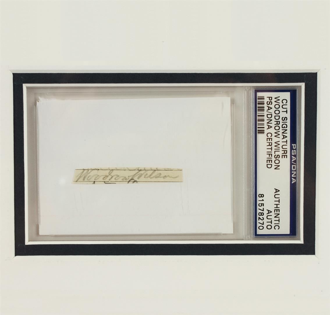 A one of a kind display featuring the autograph of President Woodrow Wilson showcased in a beautiful custom matted display that features a photo of President Wilson. The signature is authenticated and encapsulated by PSA. Thomas Woodrow Wilson (December 28, 1856 - February 3, 1924) was an American politician and academic who served as the 28th President of the United States from 1913 to 1921. This piece comes framed and ready to hang! Dimensions: 15.5" x 27". PSA Certified.