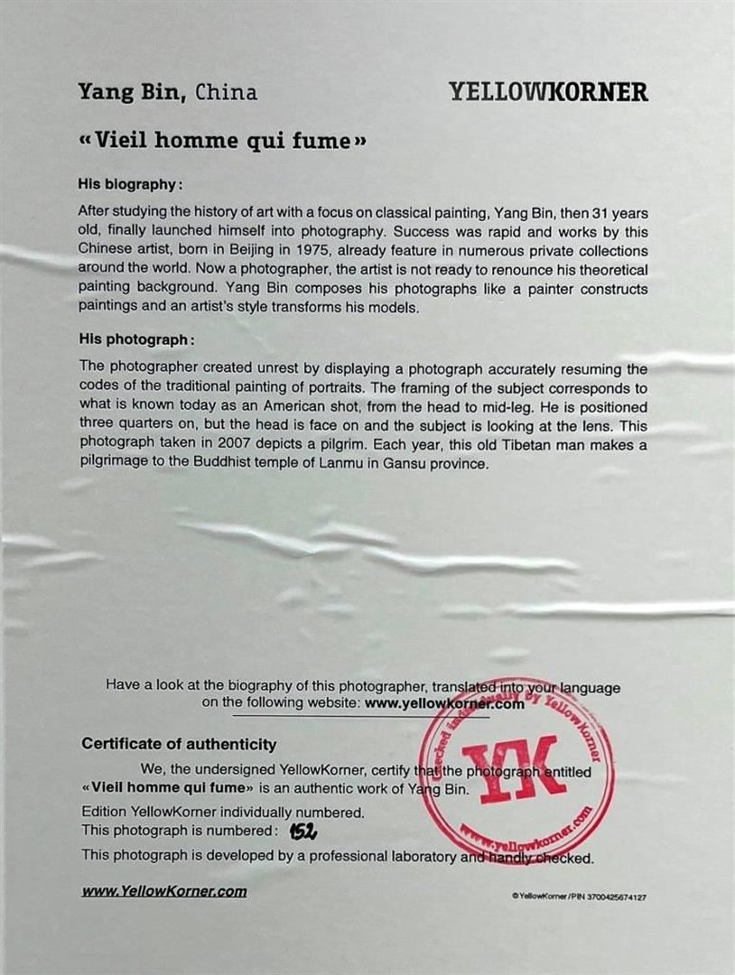 Yang Bin China Tibetan Pilgrim Smoking Pipe Lanmu Gansu YellowKorner Certified Photograph. Certificate of Authenticity from YellowKorner affixed to the back. Matted Dimensions 16"x20". Protected with Clear Mylar Sleeve.