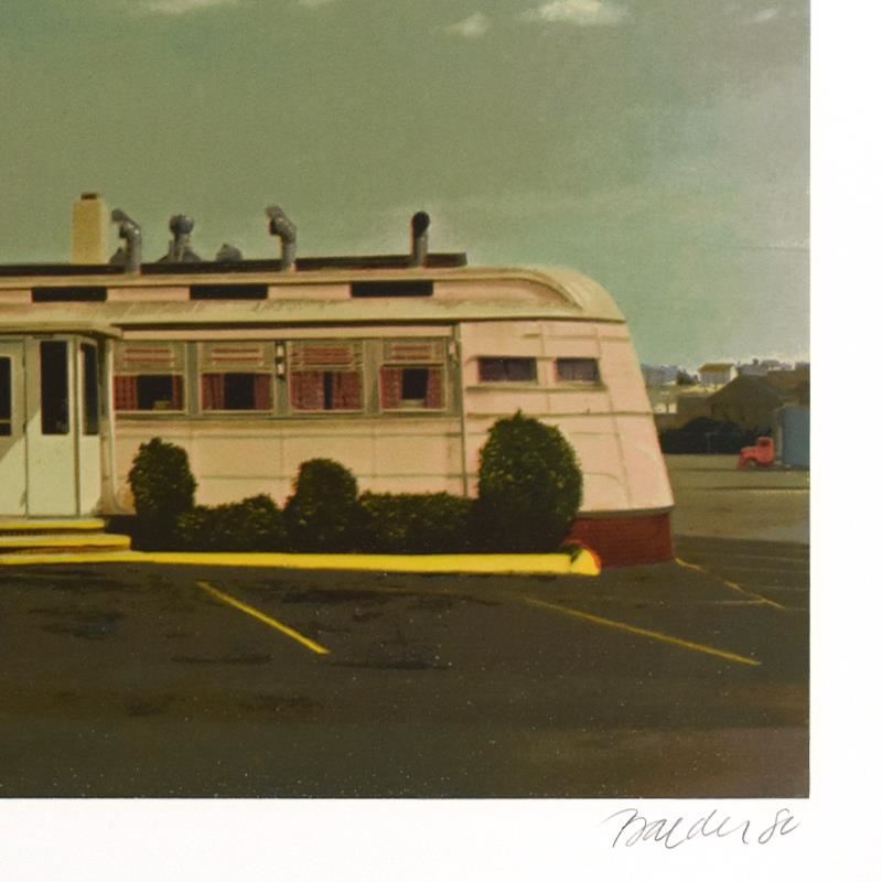 "Yankee Clipper" is a limited edition silkscreen on somerset paper by John Baeder, numbered and hand signed by the artist. Includes Letter of Authenticity. Measures approx. 30" x 22" (border); 24" x 17" (image). Due to the age of this piece there may be very minor wear on the corners that may be concealed when the piece is framed.