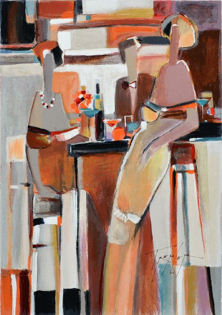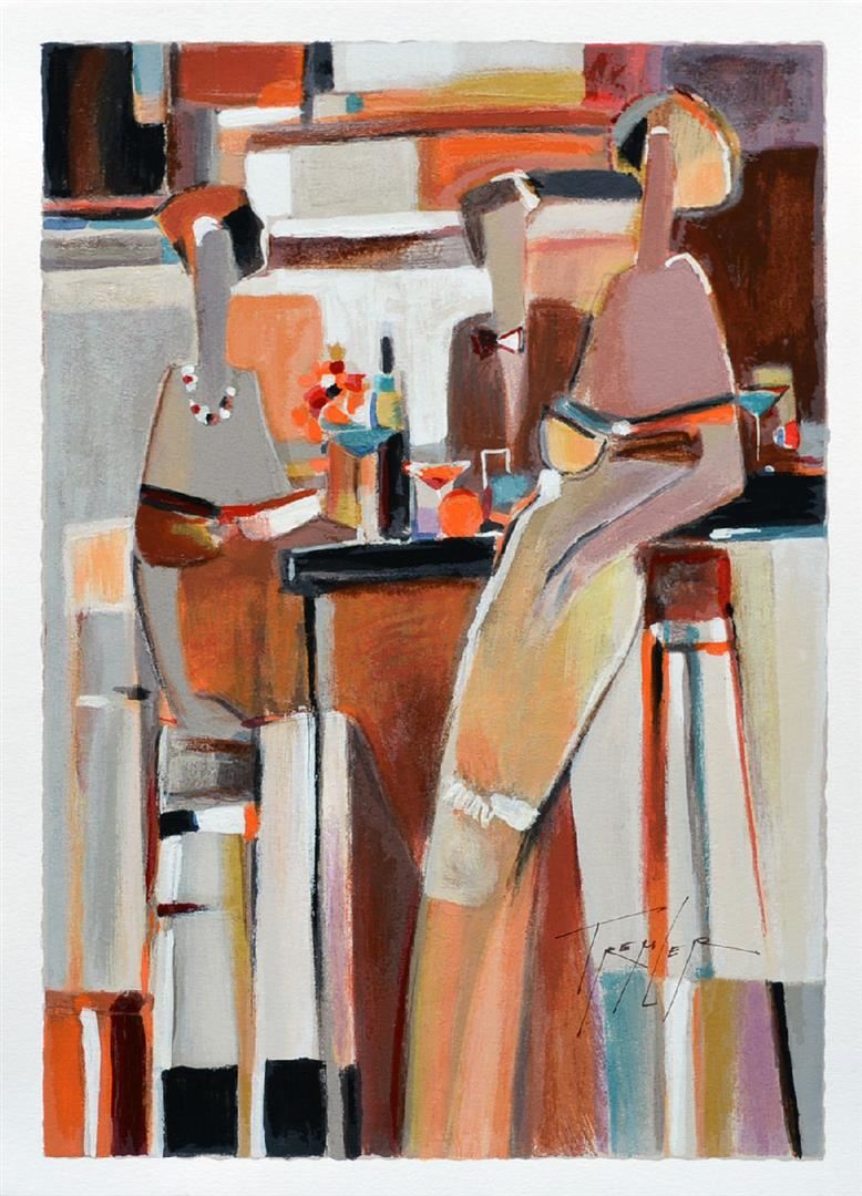 Artist: Yuri Tremler - Title: After Hours - Medium: Serigraph on Fine Art Paper - Signature: Hand-signed by the Artist - Limited Edition: 480 - Image Size: Approximately 19 inches x 13 inches - Paper Size: Approximately 20.25 inches x 14.5 inches - Unframed - Details: This work comes with a Certificate of Authenticity - Yuri's art reminds us of sudden still-life, left after an intimate party, of time spent with friends, or shared past which still excites. Sometimes whimsical, sometimes nostalgic, Tremler's art reaches inward to basic emotions of humanity.