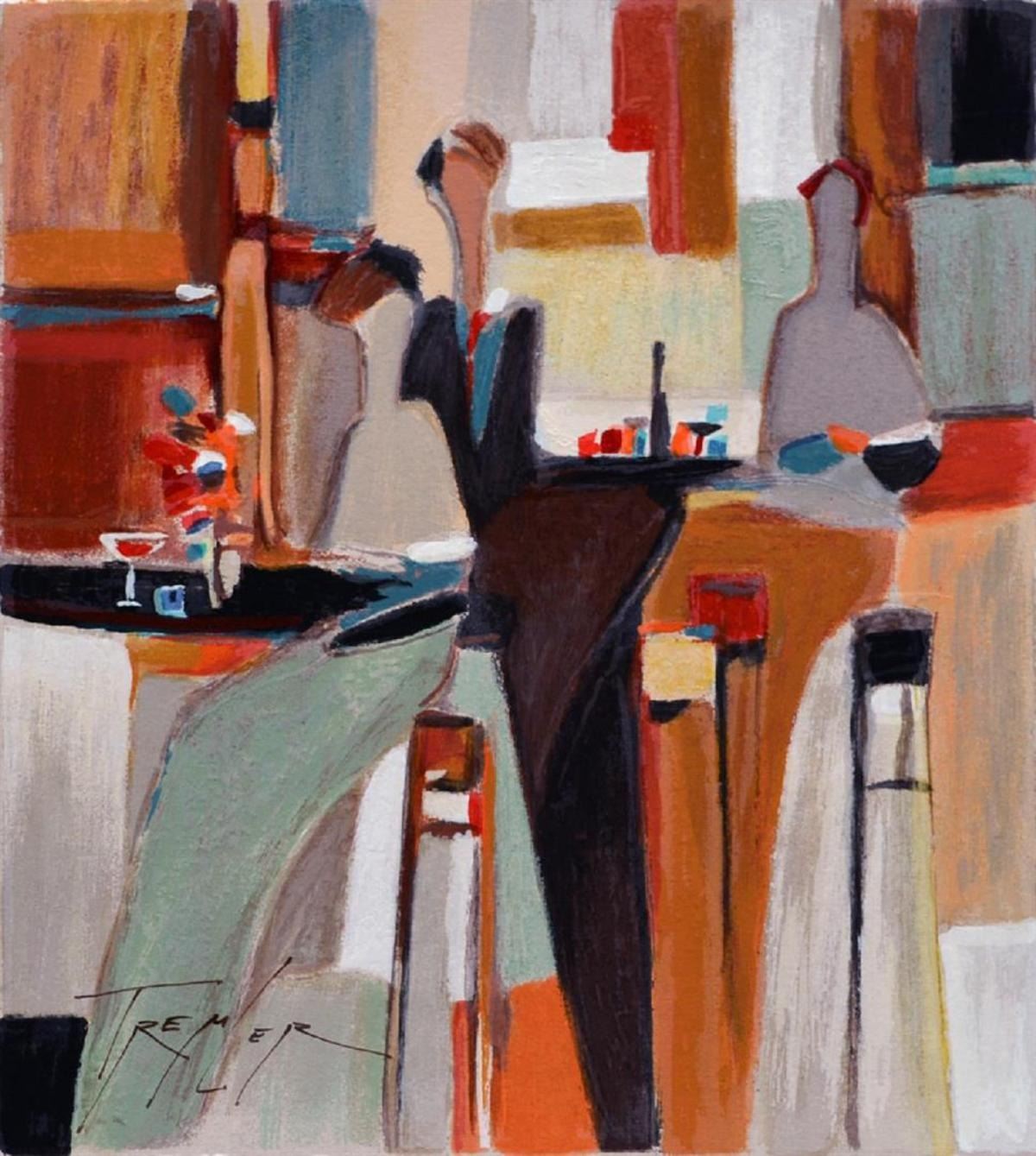 Artist: Yuri Tremler - Title: Ambiguity - Medium: Serigraph on Fine Art Paper - Signature: Hand-signed by the Artist - Limited Edition: 480 - Image Size: Approximately 13 inches x 12 inches - Paper Size: Approximately 14.5 inches x 13.25 inches - Unframed - Details: This work comes with a Certificate of Authenticity - Yuri's art reminds us of sudden still-life, left after an intimate party, of time spent with friends, or shared past which still excites. Sometimes whimsical, sometimes nostalgic, Tremler's art reaches inward to basic emotions of humanity.