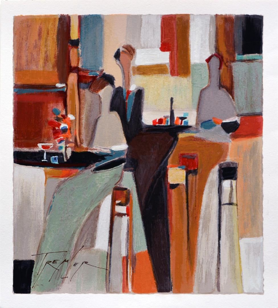 Artist: Yuri Tremler - Title: Ambiguity - Medium: Serigraph on Fine Art Paper - Signature: Hand-signed by the Artist - Limited Edition: 480 - Image Size: Approximately 13 inches x 12 inches - Paper Size: Approximately 14.5 inches x 13.25 inches - Unframed - Details: This work comes with a Certificate of Authenticity - Yuri's art reminds us of sudden still-life, left after an intimate party, of time spent with friends, or shared past which still excites. Sometimes whimsical, sometimes nostalgic, Tremler's art reaches inward to basic emotions of humanity.