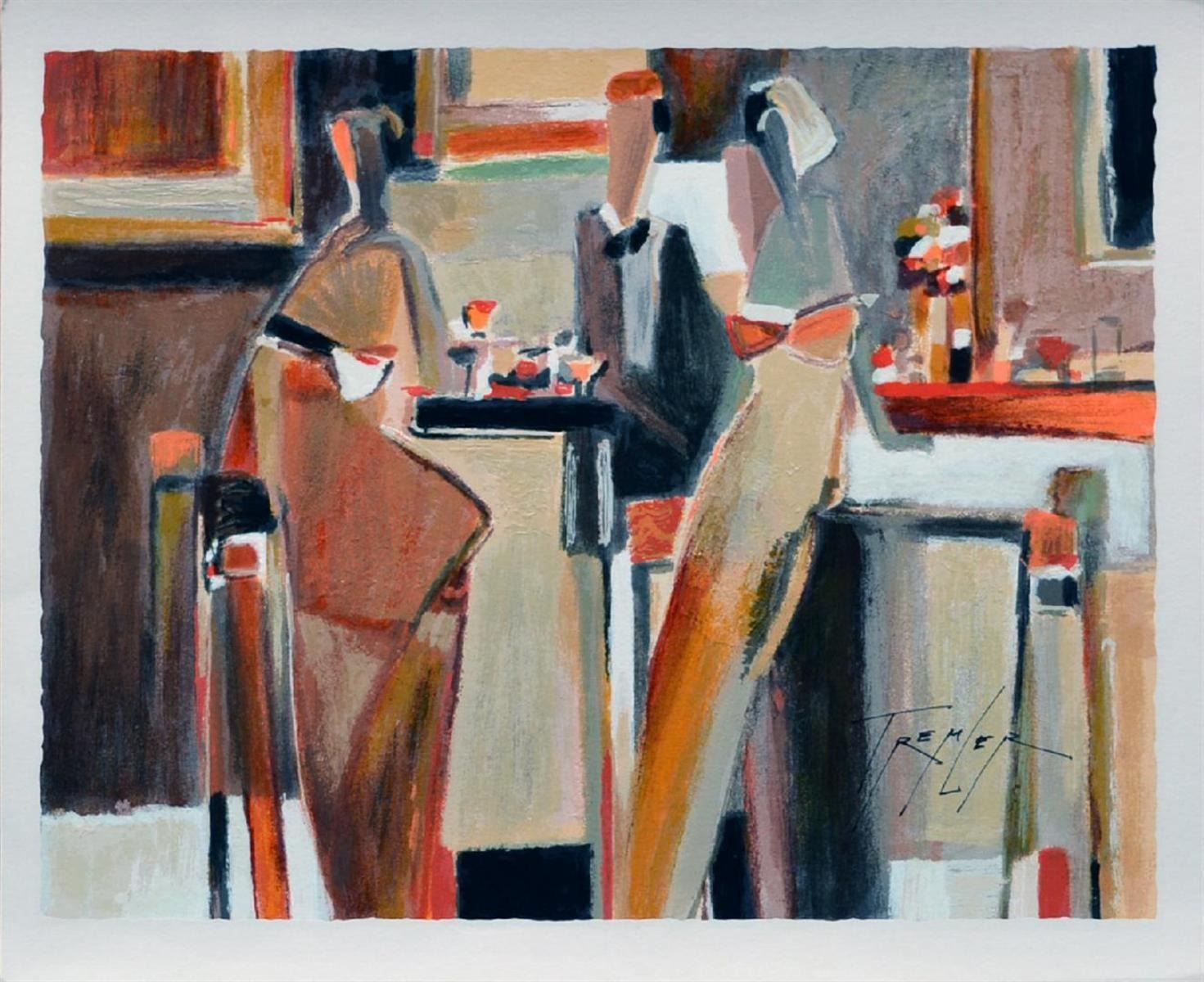Artist: Yuri Tremler - Title: Bar Scene I - Medium: Serigraph on Fine Art Paper - Signature: Hand-signed by the Artist - Limited Edition: 490 - Image Size: Approximately 12 inches x 15 inches - Paper Size: Approximately 13.5 inches x 16.5 inches - Framed: Unframed - Details: This work comes with a Certificate of Authenticity - Yuri's art reminds us of sudden still-life, left after an intimate party, of time spent with friends, or shared past which still excites. Sometimes whimsical, sometimes nostalgic, Tremler's art reaches inward to basic emotions of humanity.
