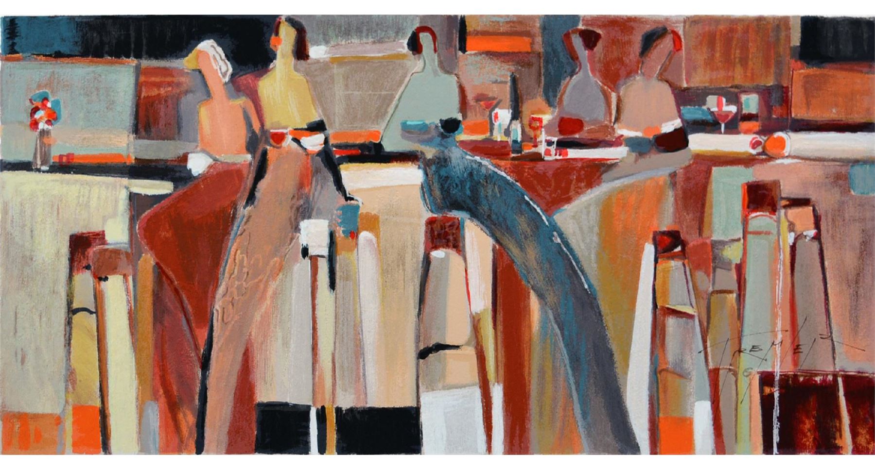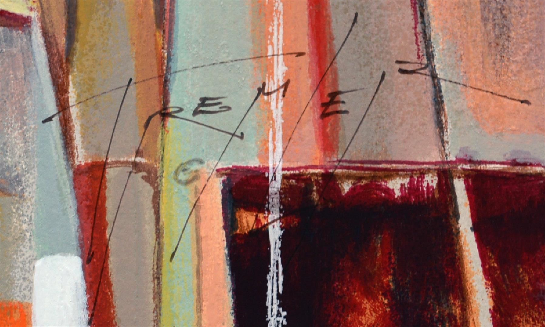 Artist: Yuri Tremler - Title: Intermezzo - Medium: Serigraph on Fine Art Paper - Signature: Hand-signed by the Artist - Limited Edition: 480 - Image Size: Approximately 12 inches x 24 inches - Paper Size: Approximately 13.5 inches x 26 inches - Unframed - Details: This work comes with a Certificate of Authenticity - Yuri's art reminds us of sudden still-life, left after an intimate party, of time spent with friends, or shared past which still excites. Sometimes whimsical, sometimes nostalgic, Tremler's art reaches inward to basic emotions of humanity.