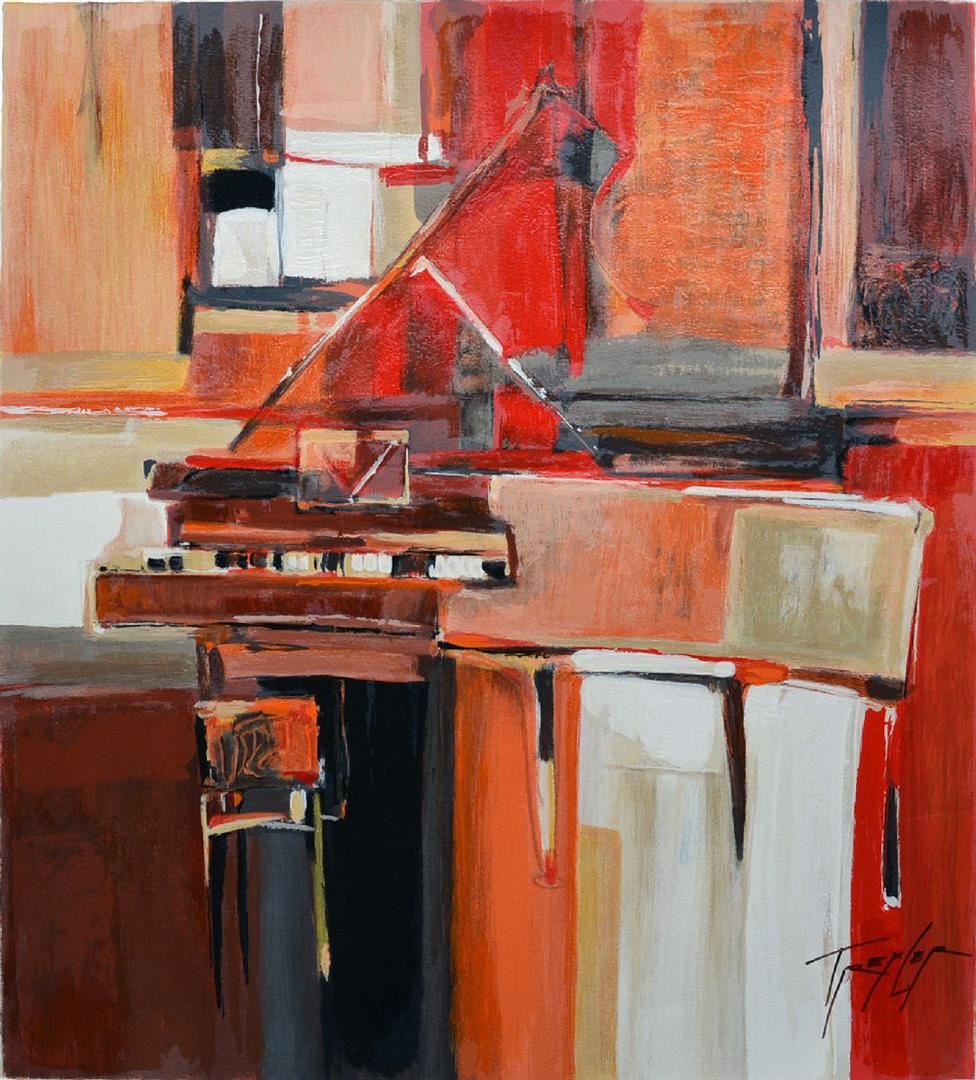 Artist: Yuri Tremler - Title: Piano in Red - Medium: Serigraph on Fine Art Paper - Signature: Hand-signed by the Artist - Limited Edition: 480 - Image Size: Approximately 31 inches x 28 inches - Paper Size: Approximately 32.25 inches x 29.25 inches - Unframed - Details: This work comes with a Certificate of Authenticity - Yuri's art reminds us of sudden still-life, left after an intimate party, of time spent with friends, or shared past which still excites. Sometimes whimsical, sometimes nostalgic, Tremler's art reaches inward to basic emotions of humanity.
